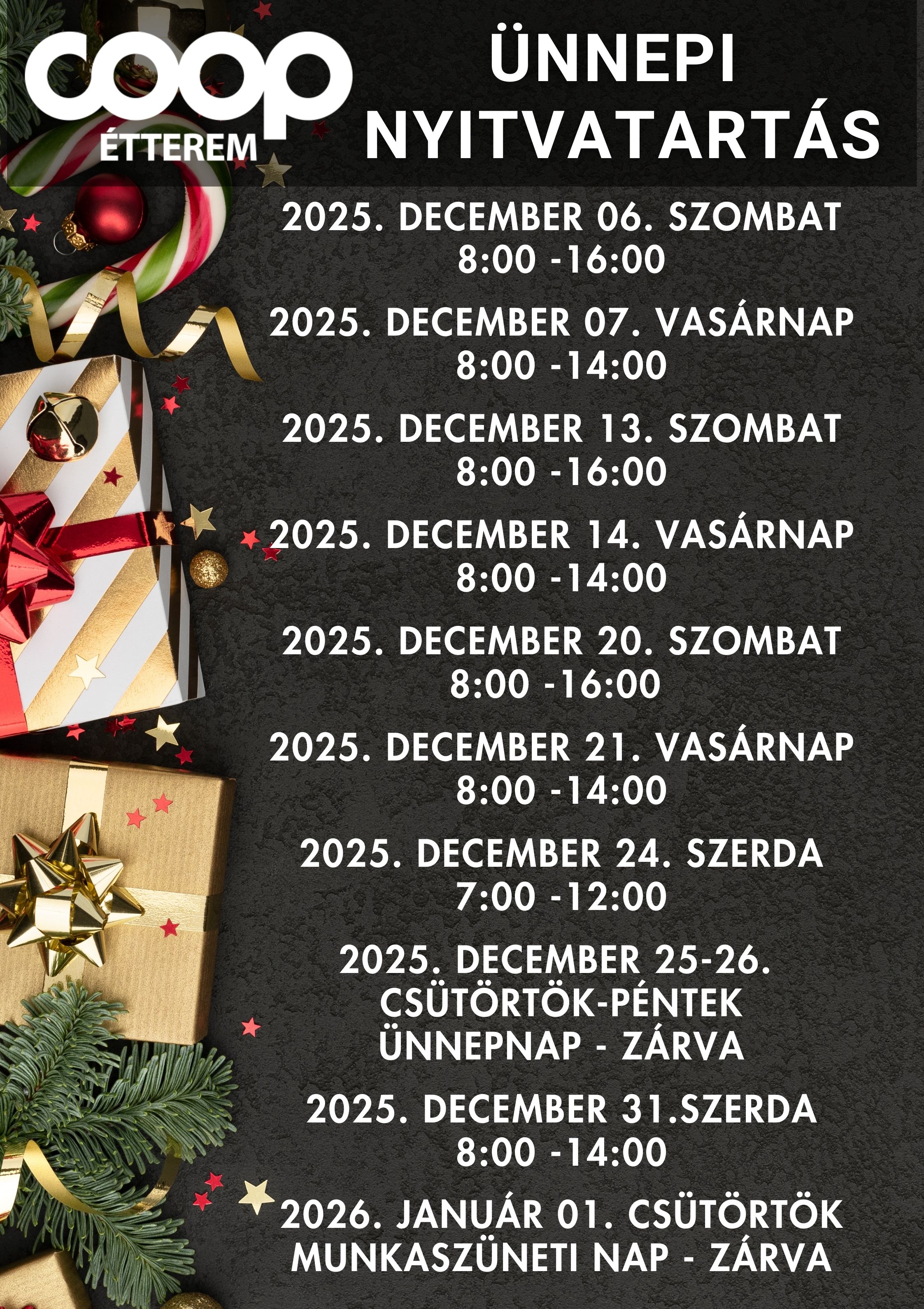 A Coop Étterem Szeged szívében, a Nagyáruház földszintjén várja Kedves Vendégeit, naponta változó, 18-20 féle ételkínálatával. Itt mindenki megtalálja a kedvére valót, gyerekektől az idősebb korosztályig egyaránt. A főként magyar ételekre specializálódott konyha naponta készít rakott ételeket, tésztaféléket, frissen sülteket, köreteket, salátákat. Mindemellett kínálatunkban megtalálható az olasz vagy akár a mexikói konyha néhány ételkülönlegessége is. A kiválasztott fogásokat lehet helyben is fogyasztani, illetve elvitelre kérni. Az ételek mellé egy üdítő, utána pedig egy finom csésze kávé és egy szelet sütemény elfogyasztására is lehetőség van. Friss sütemények széles választéka érkezik minden reggel éttermünkbe, melyek közül a legkedveltebbek a sport szelet, Erzsi kocka és a mignonok. Kávékülönlegességeink minőségi kávéból készülnek, igény szerint koffeinmentesen vagy laktózmentes tejjel is.