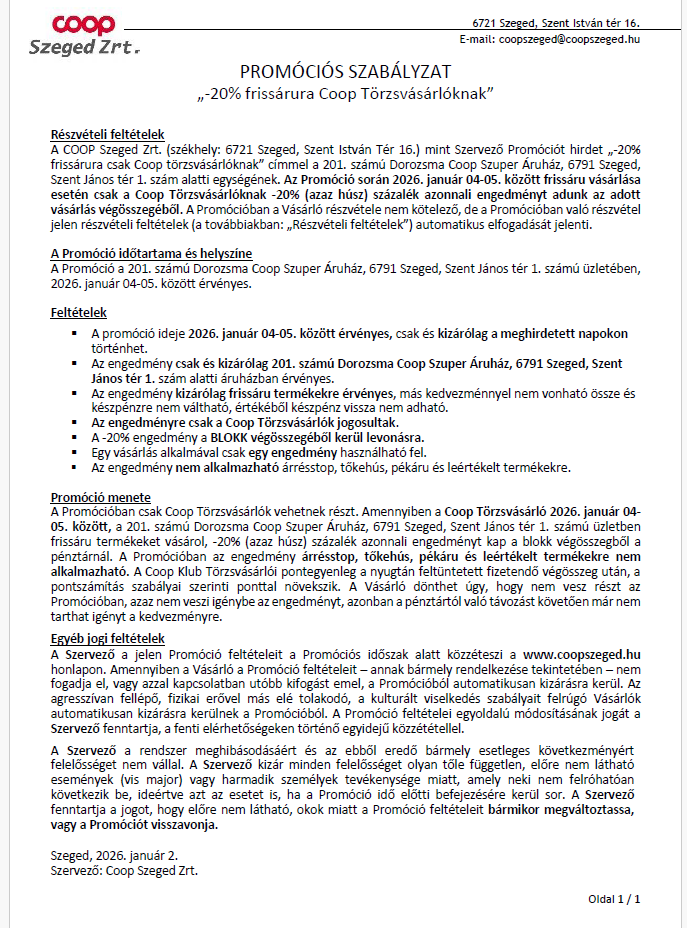 Kiskundorozsma 201.sz. Dorozsma Coop Szuper Áruház Dorozsma Coop Áruház 6791 Kiskundorozsma, Szt. János tér 1. Nyitvatartás:H-P: 6:00-20:00 Sz: 6:00-14:00 V: 7:00-12:00 E-mail: Ez az e-mail-cím a szpemrobotok elleni védelem alatt áll. Megtekintéséhez engedélyeznie kell a JavaScript használatát. Telefon: +36-62/550-688